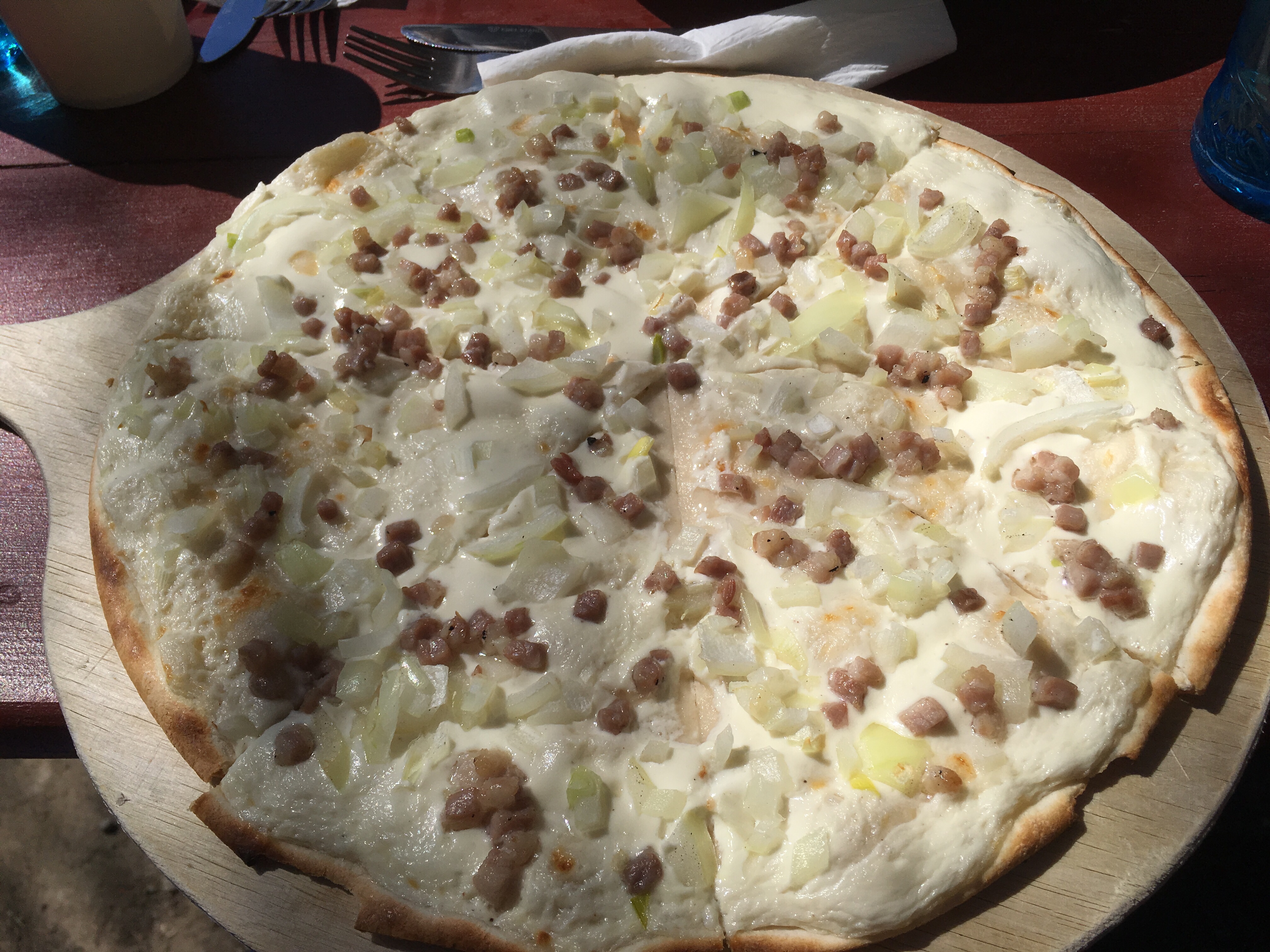Flammkuchen is something very popular in Hesse and Western Germany. I actually had it twice while I was in Frankfurt. Flammkuchen literally translates to Flame Cake. A traditional Flammkuchen, like the second photo, consists of a thin crust, thinner than any of our American pizza crusts, a sour cream like sauce topped with onions and bacon. Like pizza, Flammkuchen can have many different toppings too, like the veggie one in the first picture. The best part of about Flammkuchen is that is serves one person. You can eat a whole one by yourself and nobody will judge you.