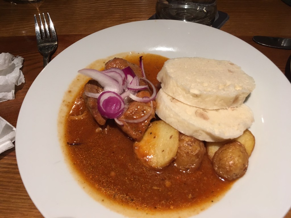 Then we walked to our restaurant, where we had our first Czech meal. It was also the best and most famous Czech meal. It was Goulash and Dumplings. Trust me, it is not what you are imagining right now. Eastern European Goulash is different than the American counter part. It consists of chunks of meat, usually pork or beef, covered with a sauce served with some vegetables, potatoes, and dumplings. Czech dumplings are also different. They look more like a slice of bread. That is because a Czech dumpling is a huge roll of dough that is boiled and then sliced.