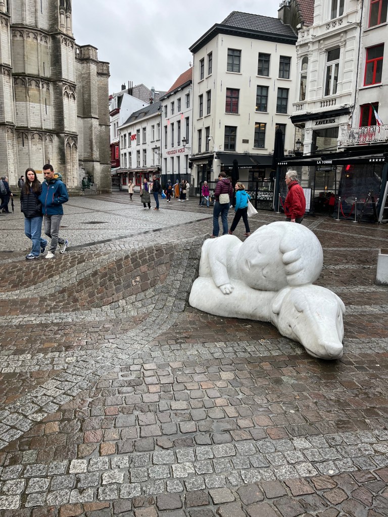 Nello & Patrasche are characters from the book, A Dog of Flanders, which takes place in Antwerp. Nello is a poor orphan boy and Patrasche is his canine friend without a home, so they explore Antwerp together. The statue, designed by Batist Vermeulen, lays right outside the Cathedral of Our Lady which plays an important role in the story. Whether you are familiar with the story or not, the statue is a worthy stop to get a glimpse of a bit of Belgian culture.