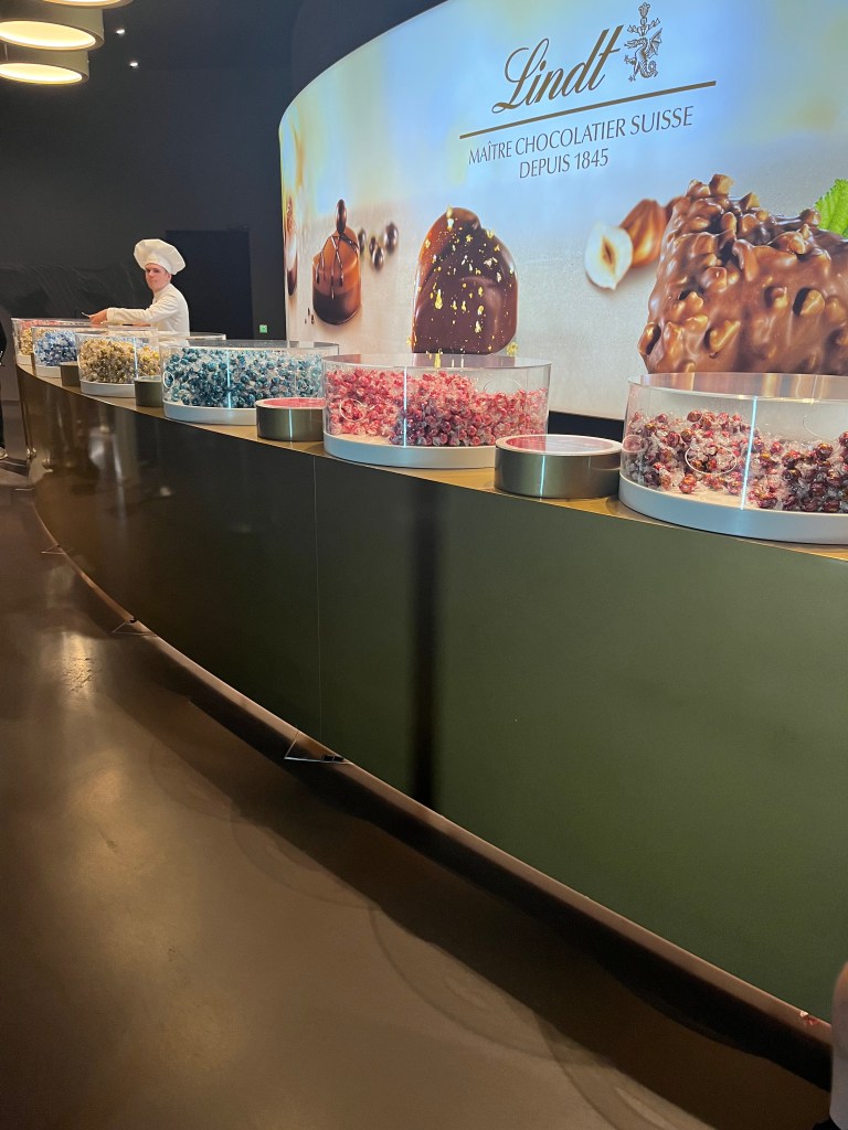 I had a noon chocolate tour at the Lindt Chocolate Museum. Entering the museum you can’t miss the giant chocolate statue. I scanned my ticket to enter, was given an audio guide, and dropped my bags off at the lockers. The thing I love about Europe is that they have lockers at museums so you don’t have to carry around your stuff. It is not like that in the United States, unless our museums do have it but it just isn’t as common as a thing to use.