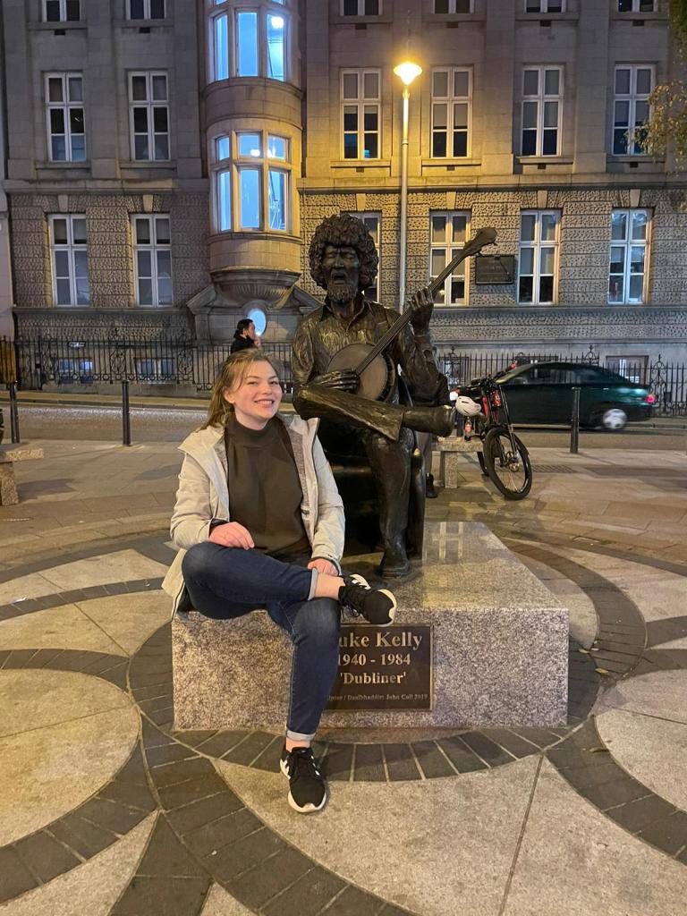 After Sweny’s we walked back towards Grafton street to check out some more shops, but sadly they were all starting to come to a close. I had bought some travel trivia cards that day, so we took a seat on a bench and played for a little bit. We also came across a Luke Kelly statue. As you may know I am a huge Irish music lover and he was a part of the band, The Dubliners. I had to get my picture with it of course.