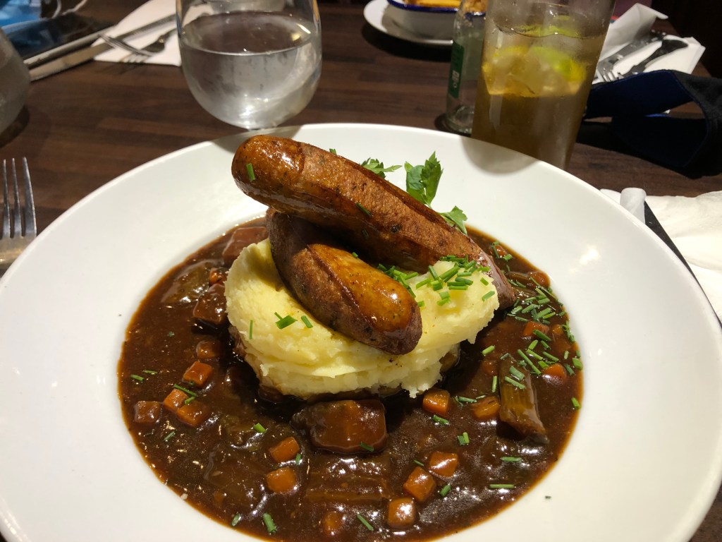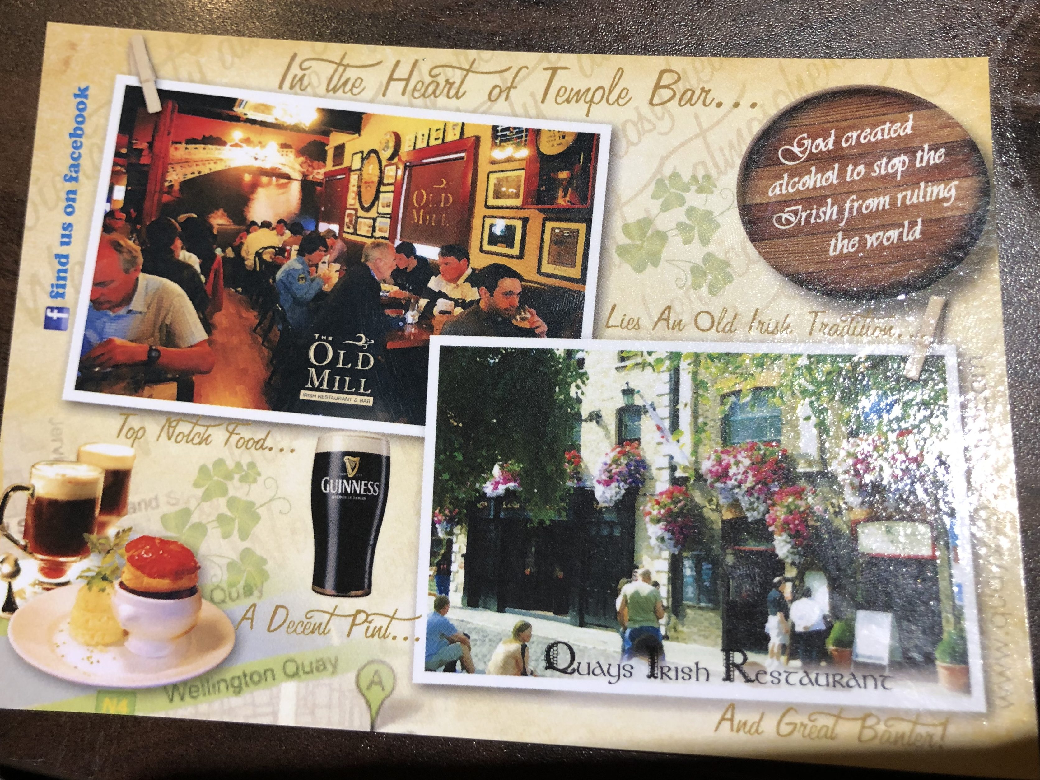 We ended up at the Old Mill Restaurant. It was a bit pricey but no more than any other decent restaurant in Ireland. Not only did we manage to find a place for dinner on Temple Bar, but it was one with traditional Irish food, so I was content. We were seated in the upstairs in a bit of a crowded corner, but we weren’t going to complain. I ordered Bangers and Mash, while not my favorite Irish food, I needed to try it once in Ireland so Dublin was that chance. I also got my typical Jameson Ginger. We were a bit rushed in order to make room for others waiting for a table, but it still was worth it. We even got a little postcard from the restaurant. I ended up with only a picture of it.