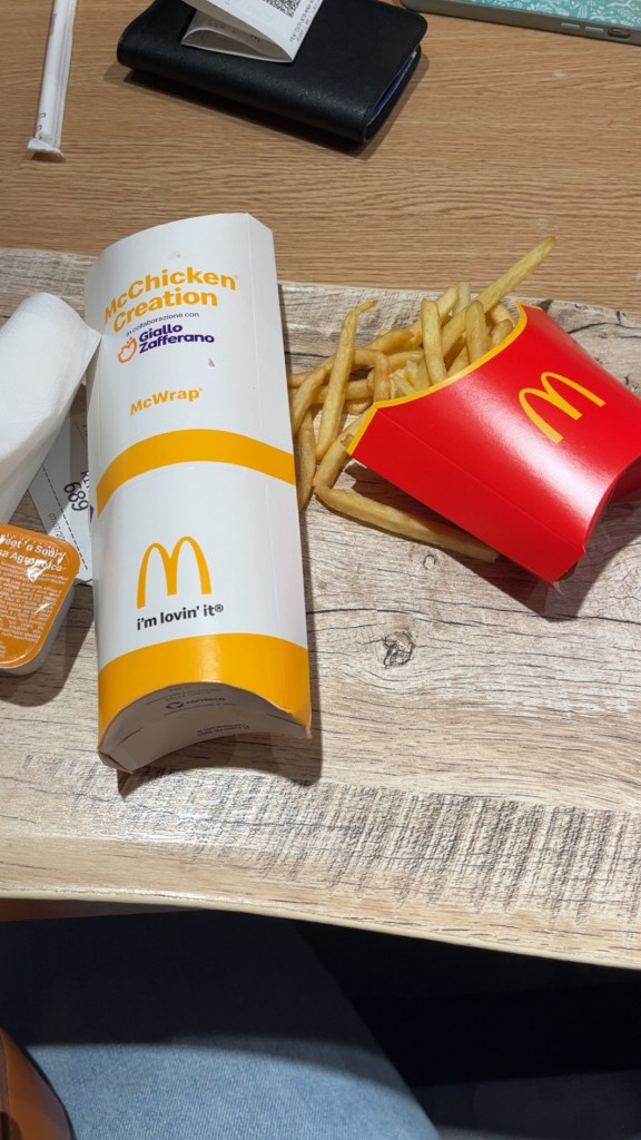 Afterwards we were done. I wasn’t going to push this day any further. We just needed dinner, which we planned to do at the hostel since it had free ingredient to make food, but we took one look at the kitchen and were like “there is no way we are cooking right now,” so we went to McDonald’s next door. I did want to have McDonald’s while in Italy anyway, because I like seeing the different versions of it around the world. I tried a spicy chicken wrap since that was something different. It was ok. On the ranks of my McDonalds I’d put it in the middle. Irish McDonald’s is going to be hard to top. I will say though that the fries were better than the ones at home.