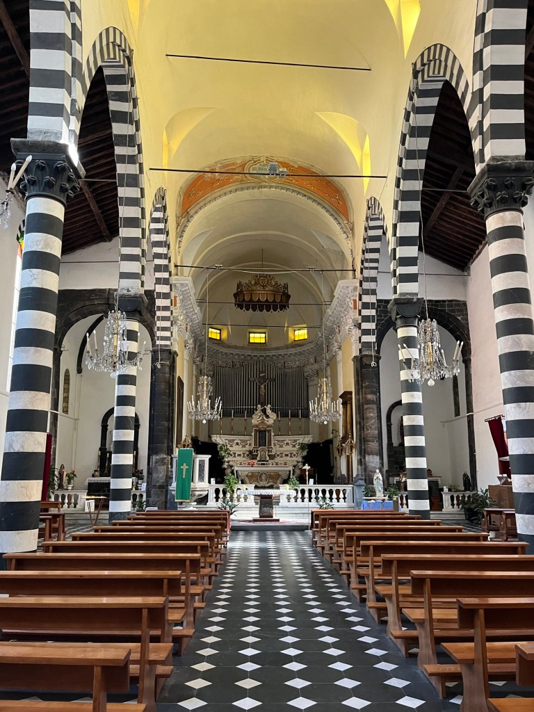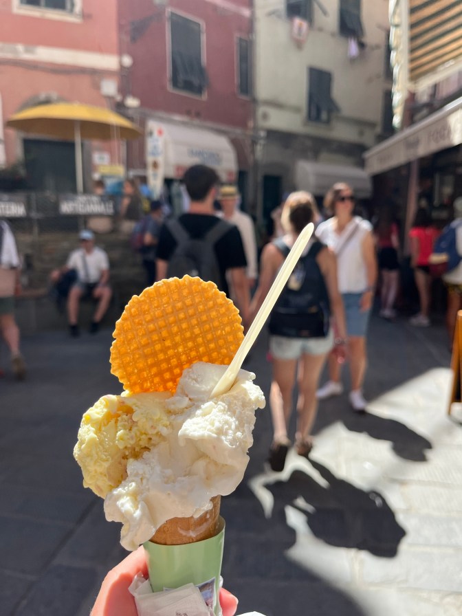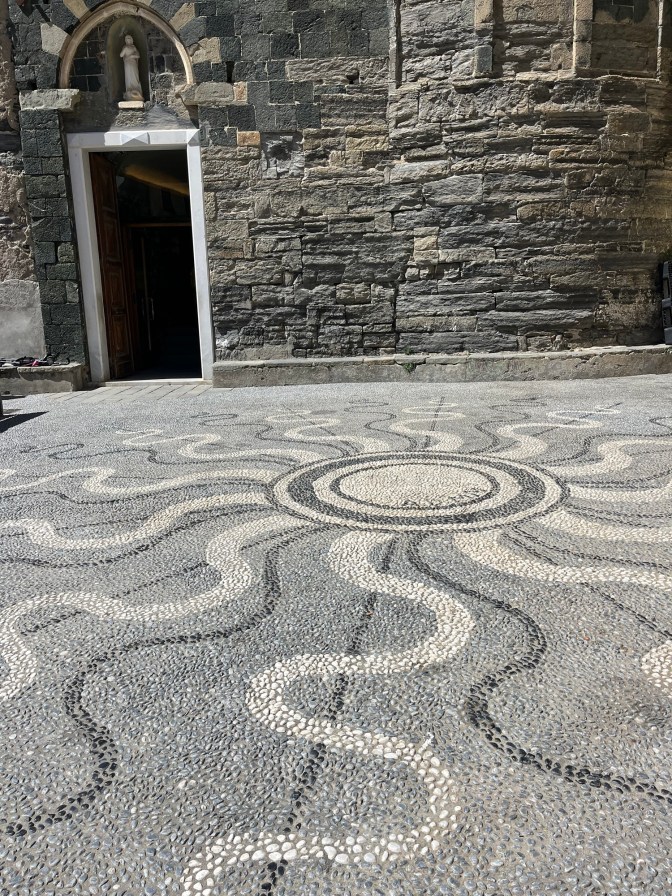 Sam was resting for a bit in the room, so I explored Vernazza on my own during that time. I got some gelato and found a spot next to the water to eat it. I also did a bit of souvenir shopping since I wasn’t sure how much time I would have the next day with our big hiking plans. I bought a magnet and a postcard of each town. I like to hang postcards on my wall, so I buy them in each place I go. This was maybe a lot for my wall, but I thought it would add a nice touch to my scrapbook! Before heading back to the room I stepped inside the little church, which had a really nice view of the water from its windows. I would have loved for a church like this to be my home parish.