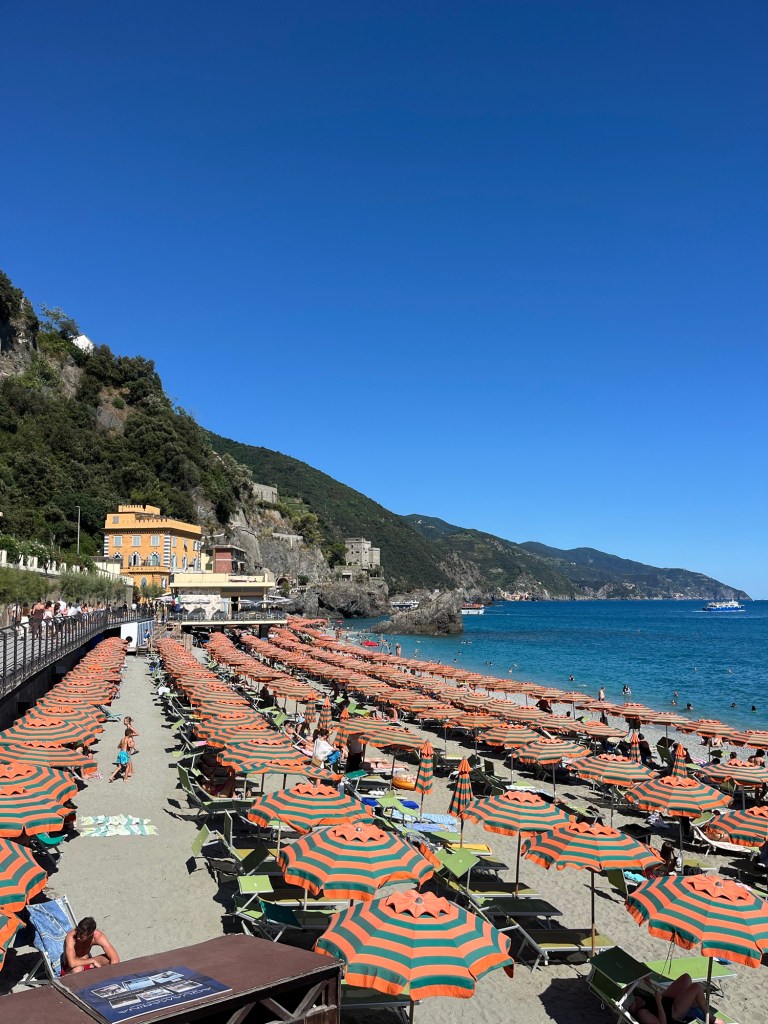 I had stopped for gelato (obviously) before setting up on the beach with my book. I only had about an hour here before I wanted to get ready to take the train to Monterosso where I would take the 5:25 pm ferry to Riomaggiore. I get some anxiety about missing things, so I wanted to get to Monterosso early, especially since I needed to buy my ticket. I ended up being a little too early and had about 20 minutes to kill, so I walked around a bit. I was also a bit hungry and wanted a snack so I bought some melon from a cafe along the way and then sat by the water to eat it. I was so content here.