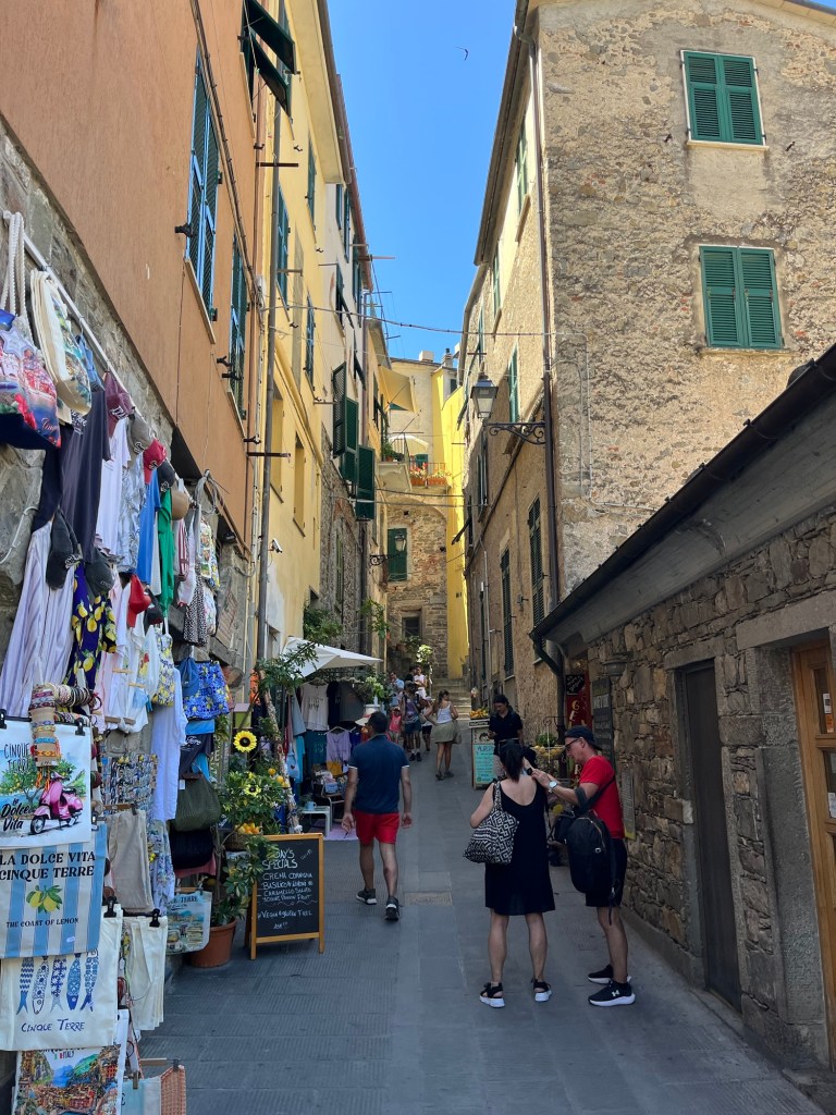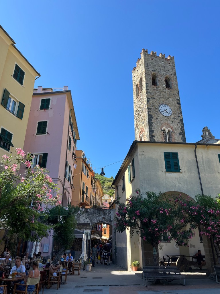 When we made it to Corniglia it was around noon and I was ready for lunch, so as we were exploring the town I stopped at a cafe for a focaccia. I am not sure if they were just really busy or maybe just a bit disorganized, but it took awhile for me to get my food. They also were a bit weird about their bathroom, because they yelled at Sam when she went over to the drink cooler so see what they had which was by the bathroom. Anyway, it wasn’t my favorite food place in Italy, but I got what I needed. We sat outside and enjoyed the small town atmosphere before heading back on the road. I will say that I loved the feel of Corniglia. It is a bit different than the other villages, because it isn’t actually on the water as it is on a hill, which means you can’t reach it by the ferry, only hiking and the train. I think this gives it a little bit of a secluded feel.
