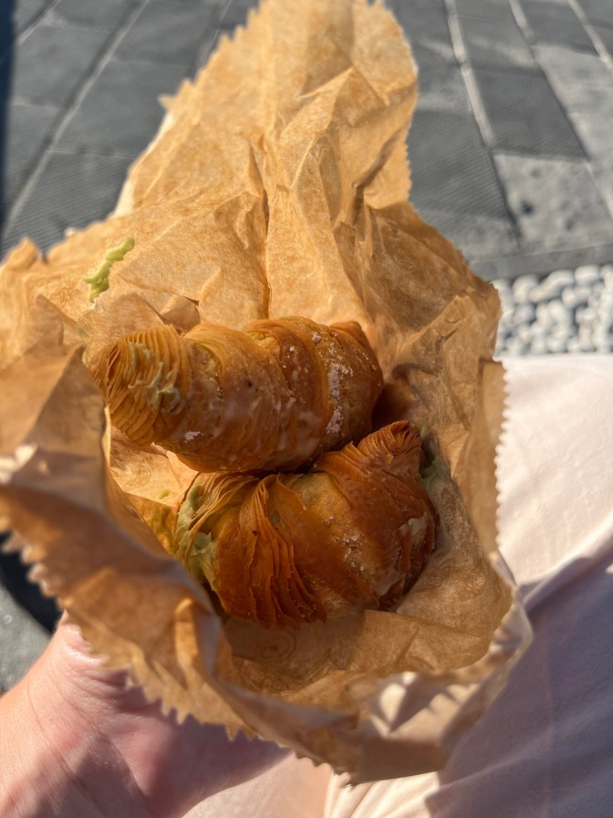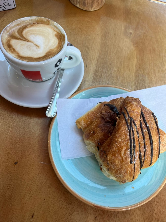I was a bit upset, because that was my original suggestion and I would have loved to have slept in another hour, but oh well. There is only so much you can control, which is something I struggle with. So, I made the best of it and luckily was able to find a cafe that was open that early. I ordered myself a chocolate croissant and a cappuccino like usual and hung out at the table outside for a bit. It was kind of nice being up before everyone else. It was so quiet and the people that were around were the workers taking care of truck drop offs and trash.
