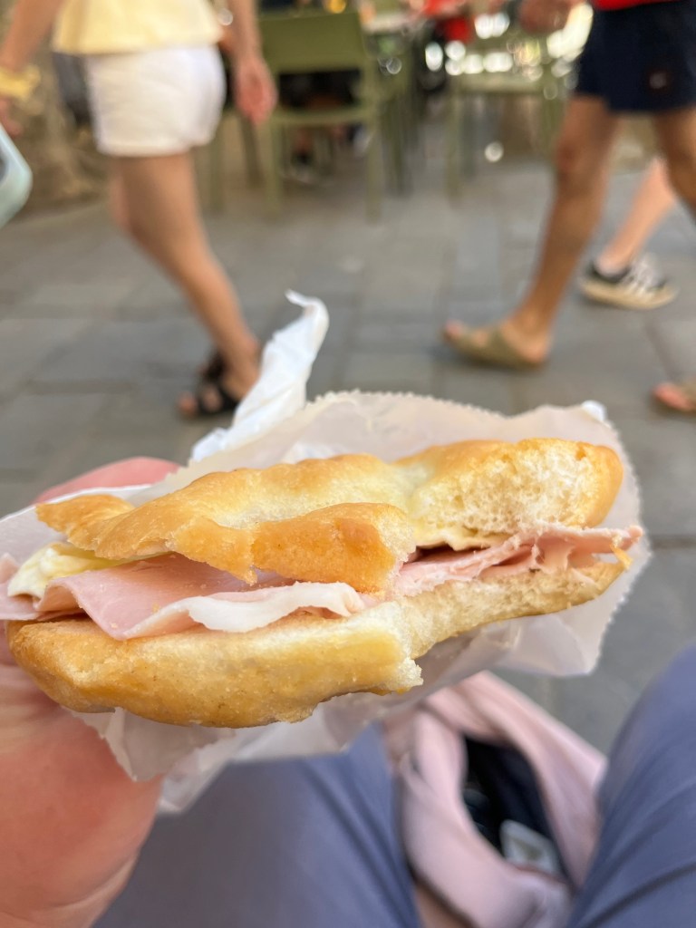 It was nearing 6 pm so the beach was not ideal as the sun was beginning to hide behind the trees making it a bit chilly, but it was still nice to hang out by the water and read. After about an hour at the beach we headed back to the train statios to go back to Vernazza. For dinner we stopped at a sandwich place to get some focaccia, since we switched things up and had pasta for lunch that day. It was a cute shop and the workers were so nice. I also enjoyed the Italian music they were playing. It sounded just like my Italian playlist. We headed back to the room to eat and my sandwich was delicious. It had chicken, onions, and a few other ingredients, but the most important part was the balsamic.