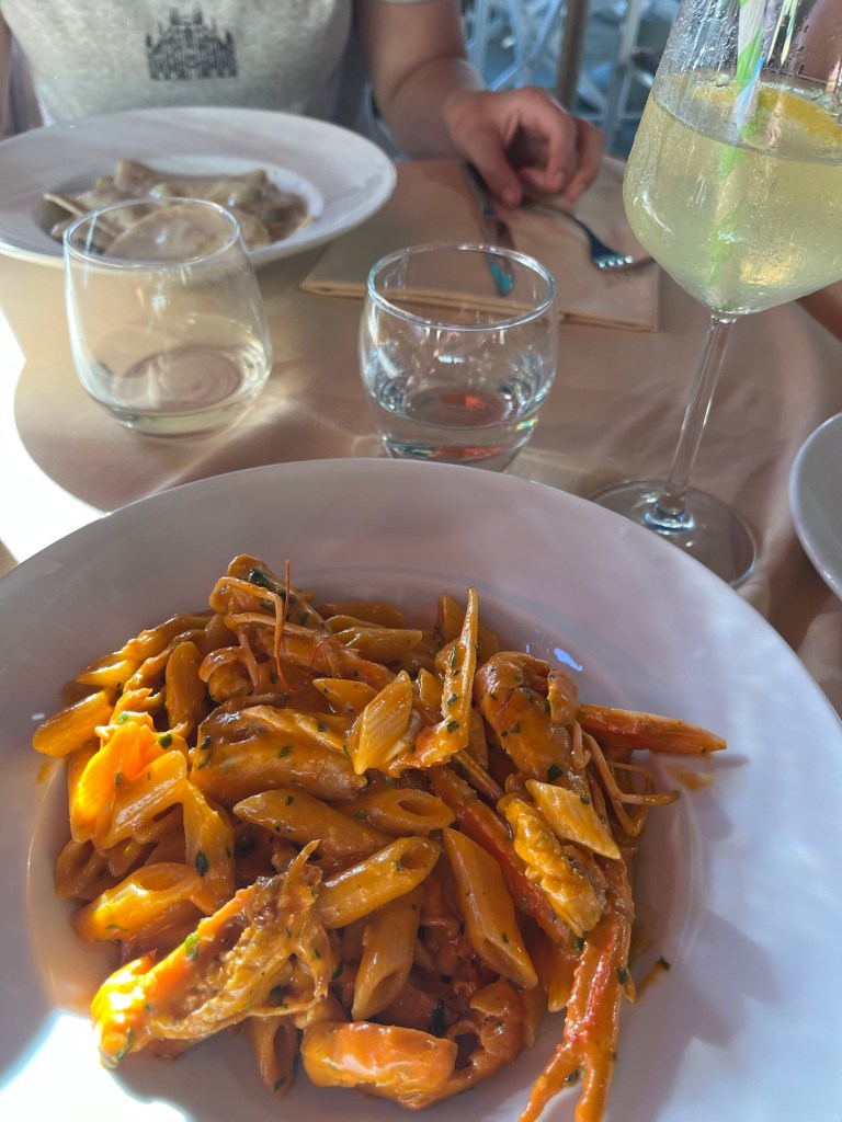 Now I can’t tell you for sure the name of the restaurant. I have learned in Italy it doesn’t matter quite as much in the United States. In most places you sit outside surround by umbrellas or a tent, so you never really see the name of the restaurant. I can tell you what I ordered though! It was a penne in a prawn sauce which means it was of course served with prawns, that I wasn’t really sure how to eat. I also ordered a lemon spritz which I wasn’t actually a huge fan of. It tasted too much like those lemon candies, if you know what I mean. We had a nice chat with the mom and daughter from the US at the table next to ours though. The daughter works in journalism and lives in Cairo, so Italy was a meeting place for them.