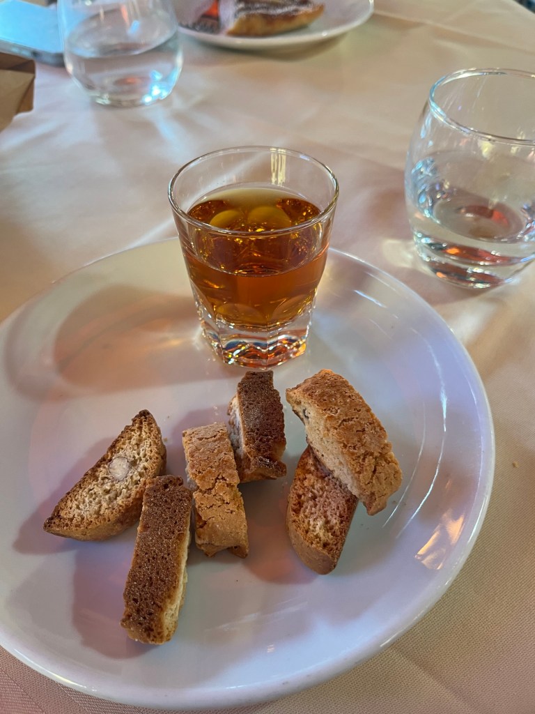 I knew I was going to order dessert not only because I had burned 1000 calories hiking, but also because I needed to try cantucci, the real Italian biscotti. Did you know that biscotti is just the Italian word for cookies and biscuits? What we think of as biscotti is actually called cantucci in Italy and it comes from the Liguerian coast and Tuscany. They tasted really good, but I am still not sure if I was a fan of the sweet wine it came with to dip in. It was a bit strong for my taste, but it tasted ok on its own so maybe I just didn’t like the combination of the two.