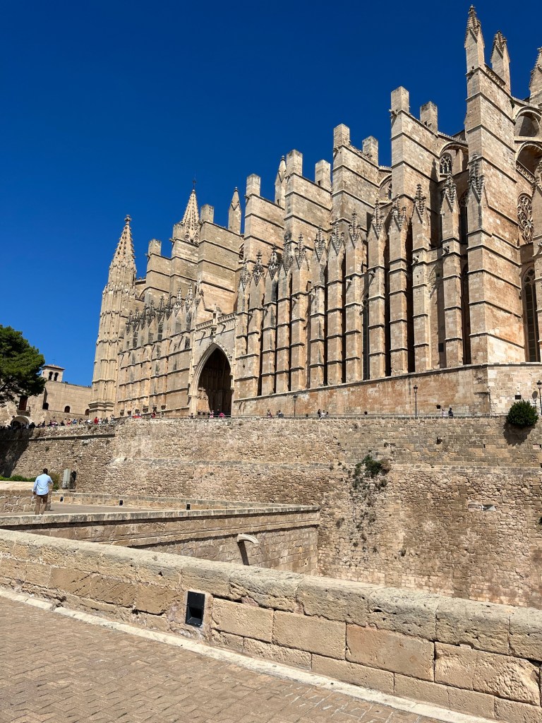 The Cathedral of Santa Maria is the symbol of Palma. It sits close to the water, making it the standout of the city by sea. It is right across from the palace and together they make up the historical center of Palma. The construction of the cathedral began in the 13th century where a great mosque had been and ended in the 17 century. It was built in the Mediterranean gothic style, which makes it the second largest gothic cathedral in the world. but what makes it unique in the work of Gaudí in the interior. Twice a year a fun occurrence in the cathedral takes places called “la seu”. This happens in the fall and the spring where the light shines through the stained glass rose window just right so that it creates a figure 8 with the other window. I tried to see this phenomenon, but the line to get inside was so long that we didn’t make it. It literally went down blocks and blocks. It is quite well known by the inhabitants of the island. You can also attend mass here in Mallorcan/Catalan or Spanish. Otherwise you can visit the cathedral and museum during visiting times for 10 euros or more to go to the terrace. Either way it is worth seeing the inside of this amazing cathedral.
