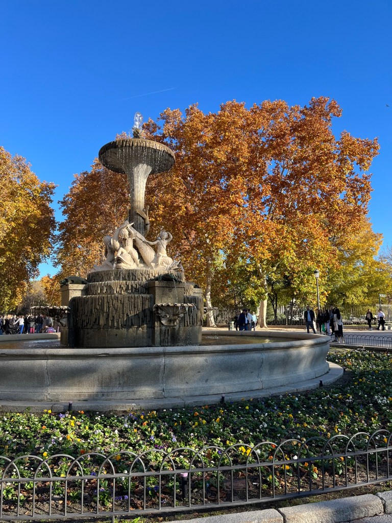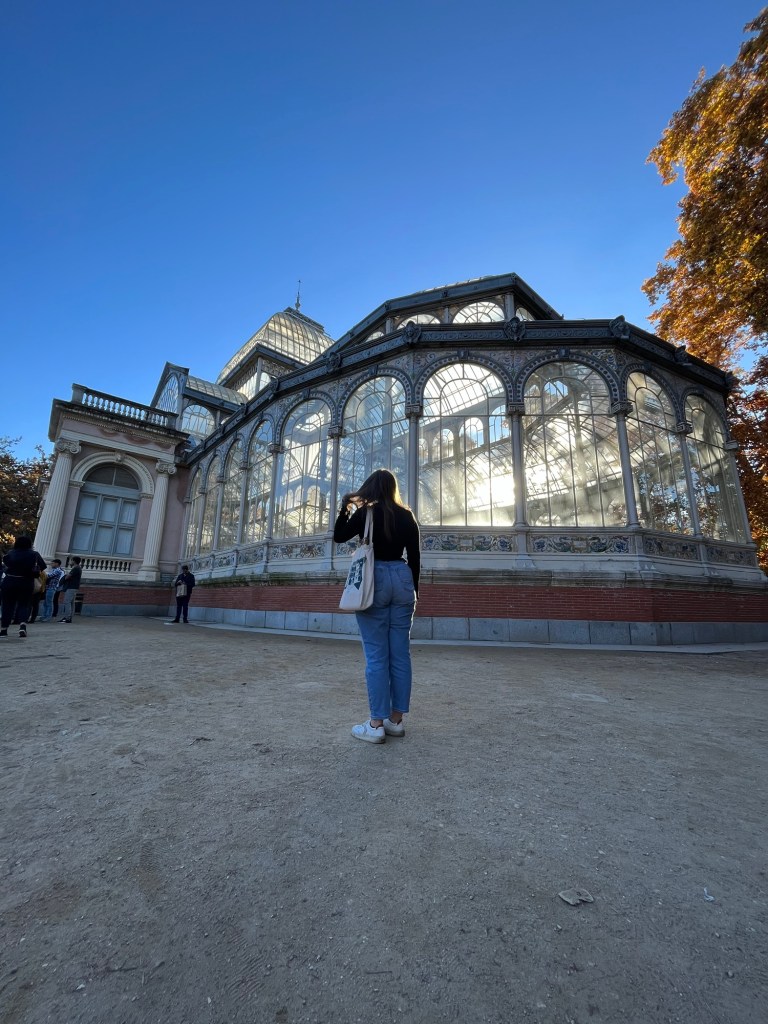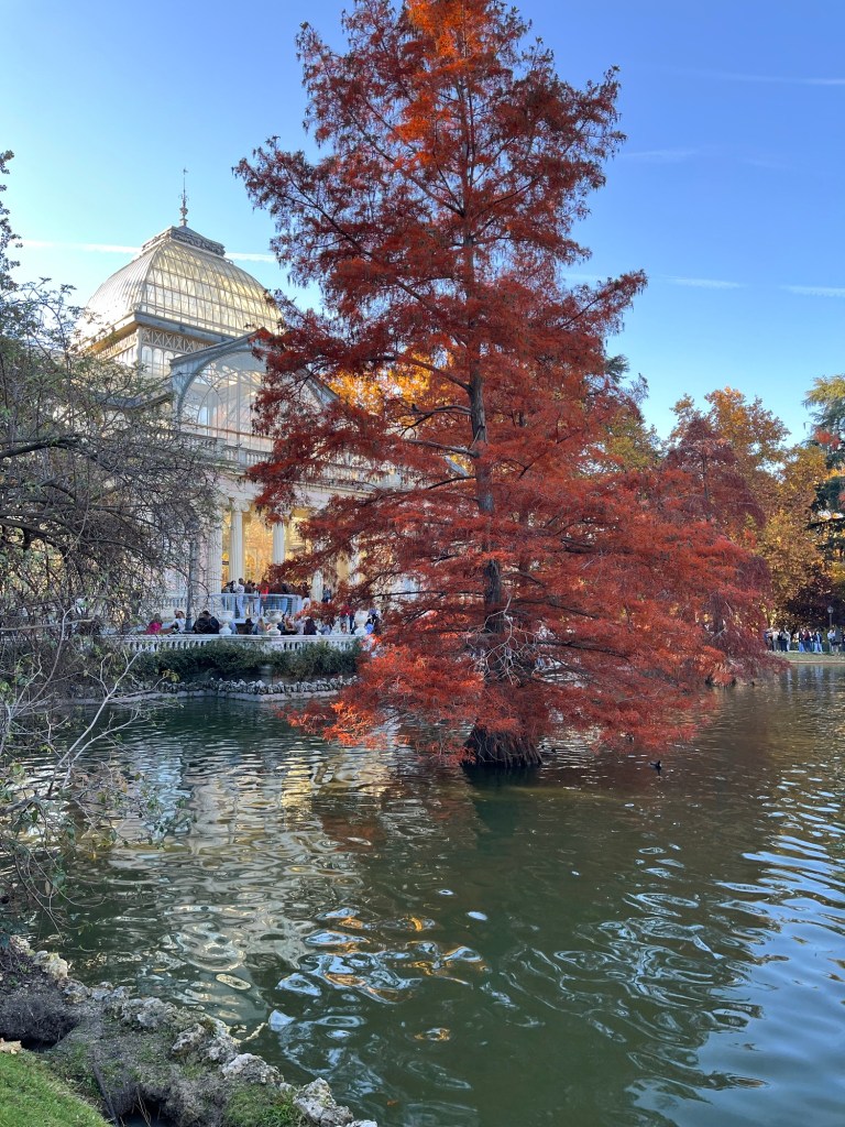 At the end of Gran Via we were met with the Madrid City Hall. It literally looks like a castle. We then grabbed lunch at Patio de Leones which while on the pricey side was very aestetcally pleasing. It had the coolest bathroom I have ever seen! We only got small things here for lunch before continuing our tour of Madrid. Lucia was showing me all the best sights. Our next stop was to Madrid’s central park, El Retiro Park. Before becoming a public park in the 1800s it was the the garden and park for the royal family. It is quite a big park and there is so much to enjoy here. As you can see in my pictures, we took advantage of every single photo opp from the pond where you can rent a boat to take out to the glass palace and its beautiful surrounding fall leaves. There are lots of walking trails with monuments scattered throughout the park. Luckily we came on a nice day so it seemed all of Madrid was hanging out and enjoying life at the park.