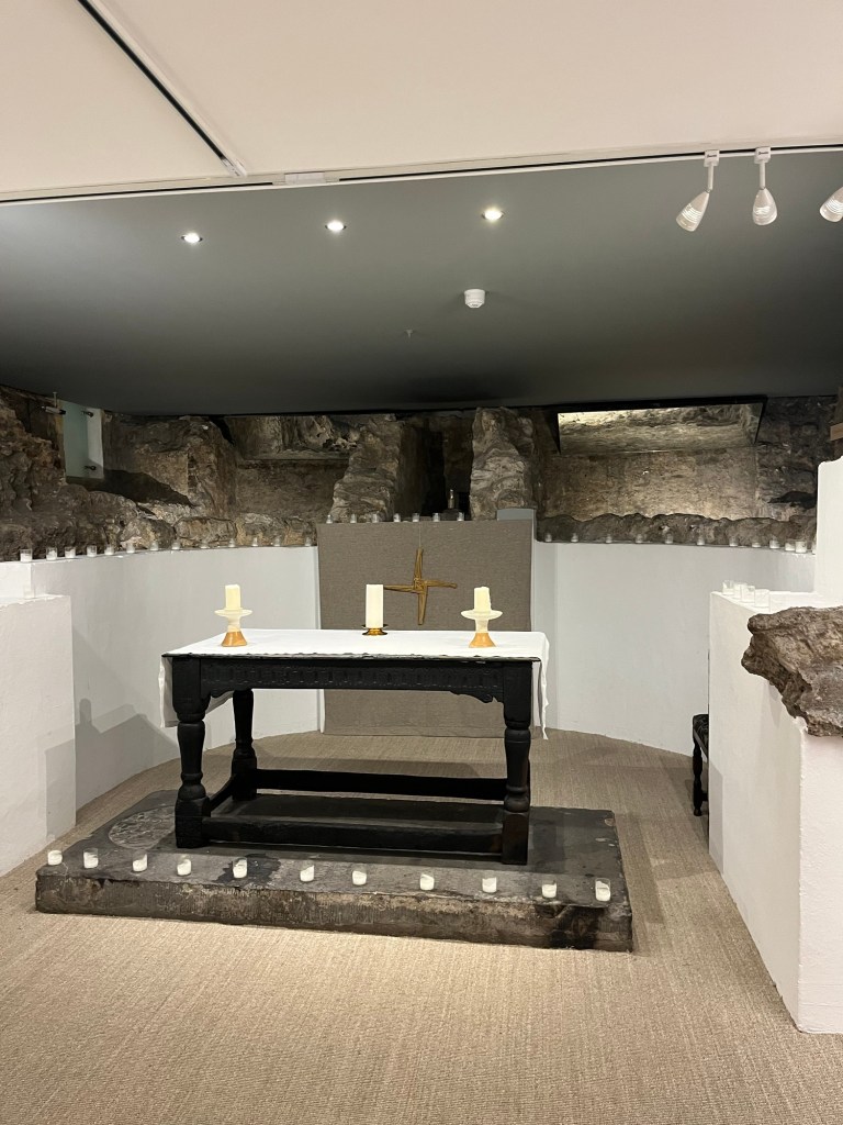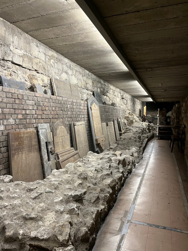 From here I continued down Fleet Street some more seeing Ye Old Cheshire Cheese Tavern and St. Bride’s church. I didn’t spend much time at the tavern, but I did thoroughly explore the church. It took me a while to realize this was a church of England church and not a Catholic church. Here was my confusion, first off, many of the Anglican and Church of England churches closely resemble Catholic churches with their altars and pews. Second, it is named after the Irish saint, St. Brigid. Saints are a catholic notion as are the Irish predominately Catholic. And this church had a lot of Irish influence. It was even holding a Celtic calm. This church was free to enter and even included a museum in the crypts. Here you can learn all about the history and significances of the church. The most important thing you need to know is that it was the inspiration for the first tiered wedding cake. It was a well worth stop and a great way to get out of the rain.