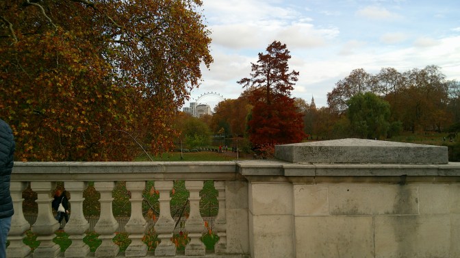 Buckingham Palace was on one side and I needed to get to the other so I pretty much walked the entire thing taking in the fall leaves and sunshine. It was a beautiful fall day. It was quite busy since the Changing of the Guard had just finished and I did get a kick out of some of many tourists getting excited about the squirrels (like seriously I have at least 10 at a time in my yard back home in Minnesota), but it still was quite enjoyable. It was nice to take a break from London’s city setting to experience some nature.