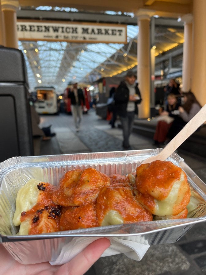 The boat gave me many great views of Big Ben as well as Tower Bridge by water. It was definitely worth it, even though it did cost me more than taking the metro or bus would be. I got to Greenwich around 1:30pm and I was hungry so I went straight to the Greenwich market which was just a few minutes walk from the pier. This actually ended up being my favorite market I went to in London. It was smaller and much less busy than the others but had great food options! After doing a few laps to decide what I wanted, I finally landed on getting Momos, a Nepalese dumpling. I got a mix between the meat and vegetable ones and had them topped with the signature sauce. The guy selling them to me asked me how spicy I wanted them and I told him I like spicy, but I know that my spicy is probably different than your spicy, so he made them as medium spicy for me as he could which was just perfect. I grabbed a sparking water from another stand and sat on the ledge at the entrance to eat my lunch. It was amazing!!