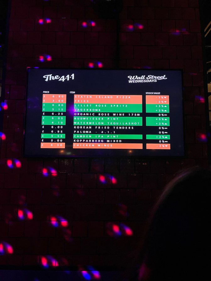 After dinner I got ready at the hostel to check out a stock market bar in Angel. This bar, called 411, does stock market nights on Wednesdays where the price goes up and down depending on demand. My roommates and I were really excited to go, but it ended up being a bit of a disappointment.