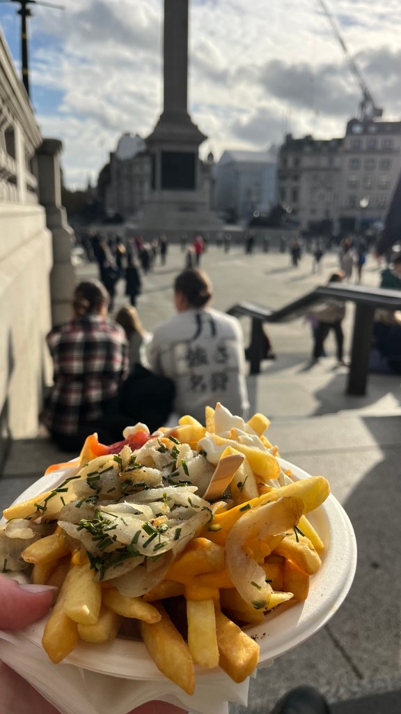 Afterwards I was really hungry! I was planning to get lunch in Covent Gardens, but I absolutely could not wait. Instead I walked to Trafalgar Square the way I did before, which made me think maybe I should have waited to do my walking tour until that day, but that’s ok. Once I got to Trafalgar Square, I went up to the Christmas market to get food. I wasn’t exactly in a Christmas mood because this was the nicest day it had been there, with a temperature in the 60s (F) and the sun was shining. It felt like September, not Christmas season.