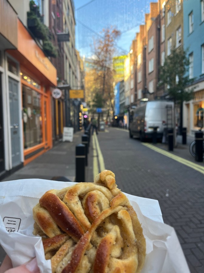 After walking through Neal’s Yard, which is very touristy now, I explored the rest of the streets. Now, while I was not hungry after eating a whole bowl of fries, I had come across and Ole & Steen’s. This whole trip I had been wanting to go to one and the timing just wasn’t right. I felt like this was my chance since I only had one more day left in London after this and what better way to enjoy it then on the streets of Covent Gardens. I went inside and got a Cardamom Bun togo.