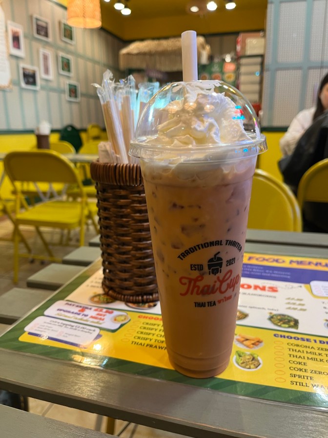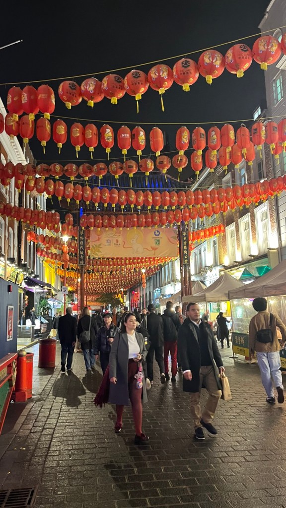 At this point I had maybe half an hour left before they closed so I skimmed the last of the rooms I wanted to visit like medieval Europe and the stone Moai from Easter Island. Then they started the announcements to get people out and everyone began to leave, so I didn’t actually have half an hour. When I got out it was completely dark and I had 3 hours until my show in the Westend. I had two options: I could go back to the hostel to rest for a bit and then come back for dinner and my show, since I wanted to go to Chinatown for dinner, or I could just hang around until then. I ended up just finding spots to hang around until then because the metro would be about an hour there and back which meant if I wanted to do dinner, I would probably not even have an hour at the hostel, so I ended up getting some tea at a Thai tea place called Thai Cup for a bit to wake myself up. I also needed to charge my phone and rest my feet, so it was a much needed break. It also gave me a moment to plan out some of the logistics of getting to Ireland in a couple days.